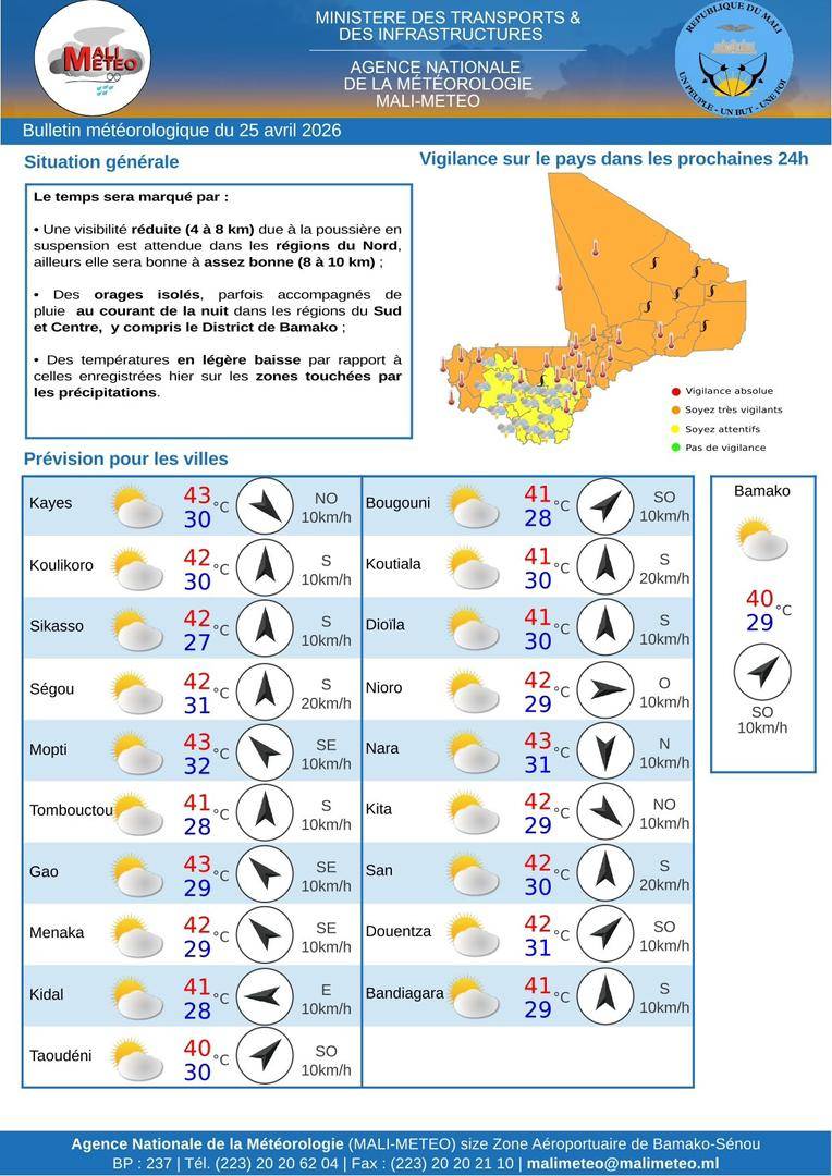 Mali- Météo : visibilité réduite au nord et orages isolés attendus au sud et au centre le 25 avril