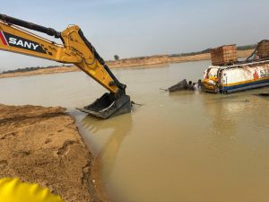Ce bac qui est conçu pour transporter 20 tonnes avait à son bord plus de 40 tonnes dont une mini citerne de 14 tonnes et une machine pelleteuses de plus de 30 tonnes. C’est sous ce poids que le bac s’est abîmé en plein milieu du trajet.