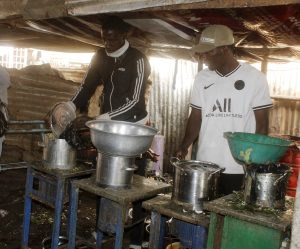 Au marché de Kalanban Coura, deux jeunes hommes installés ont organisé leur espace de travail méthodiquement agencé de quatre appareils, des bidons d’eau de vingt litres, des bacs en plastique, servant à laver et des couteaux pour éplucher et nettoyer les produits.